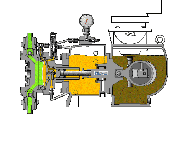 隔膜泵的缸蓋主要由隔膜隔開,以將待輸送的液體與工作流體分開。當隔膜移動到傳動機構的一側時,泵缸中的工作室會在負壓下抽吸液體。當隔膜移動到另一側時,然后排出液體。待輸送的液體通過泵缸中的隔膜與工作流體分離,并且僅與泵缸,吸入閥,排放閥和隔膜的內側接觸,而沒有與柱塞和密封裝置接觸,因此重要部件例如塞子完全在含油介質中工作,并且可以處于良好的工作狀態(tài)。下圖顯示了隔膜泵的工作狀態(tài)。